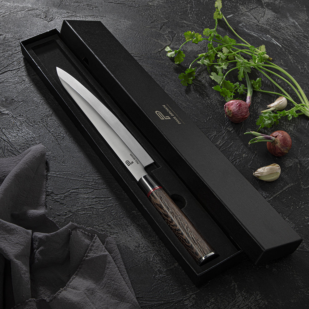 The full tang wenge wood handle provides excellent balance, comfort, and durability, while the lightweight 238 g design makes it easy to handle for long use. Perfect for slicing sushi, sashimi, raw fish, and other fine ingredients, this knife combines traditional Japanese craftsmanship with modern performance—an essential tool for both professionals and home chefs.