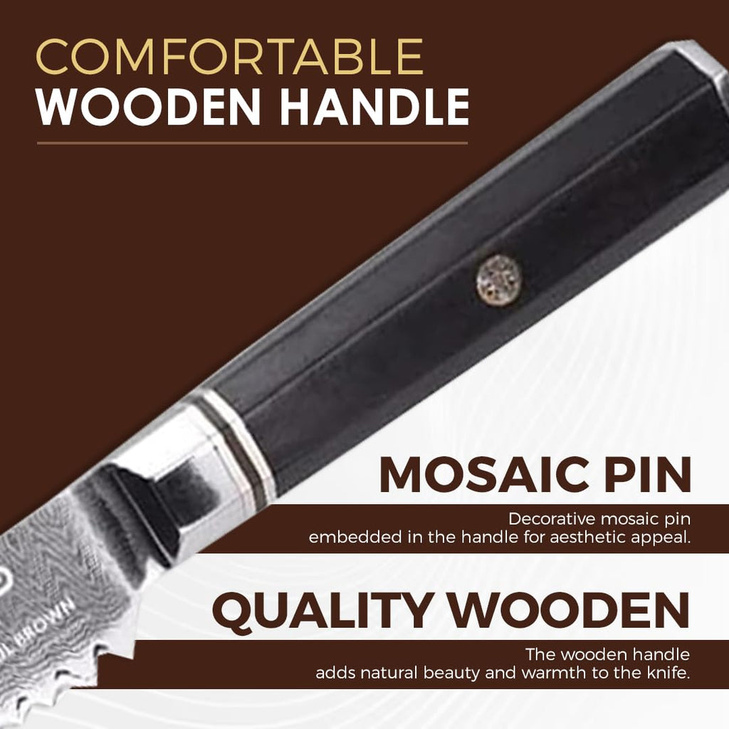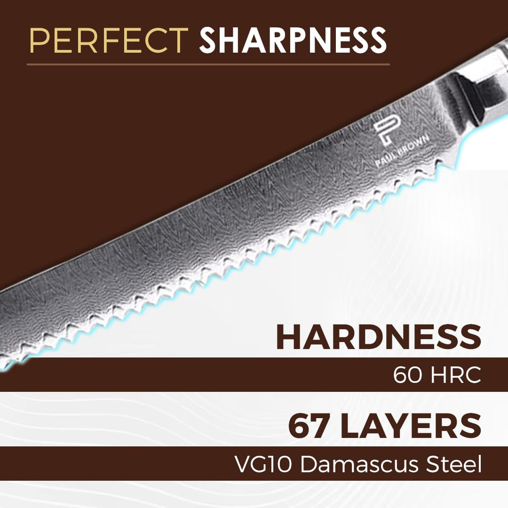 ✅ PAUL BROWN QUALITY- a PAUL BROWN is a combination of Outstanding craftsmanship and cutting-edge breakthrough technology, awe-inspiring design, and the absolute best materials available. The 67 Layers real forged steel with hammered pattern supporting real VG-10 high carbon super steel is complemented by wood handle and gives you ultra-smooth and precise use for all needs like meat, fish, vegetables and fruits etc.