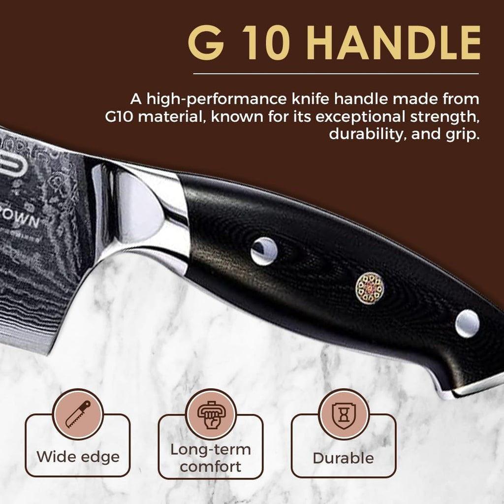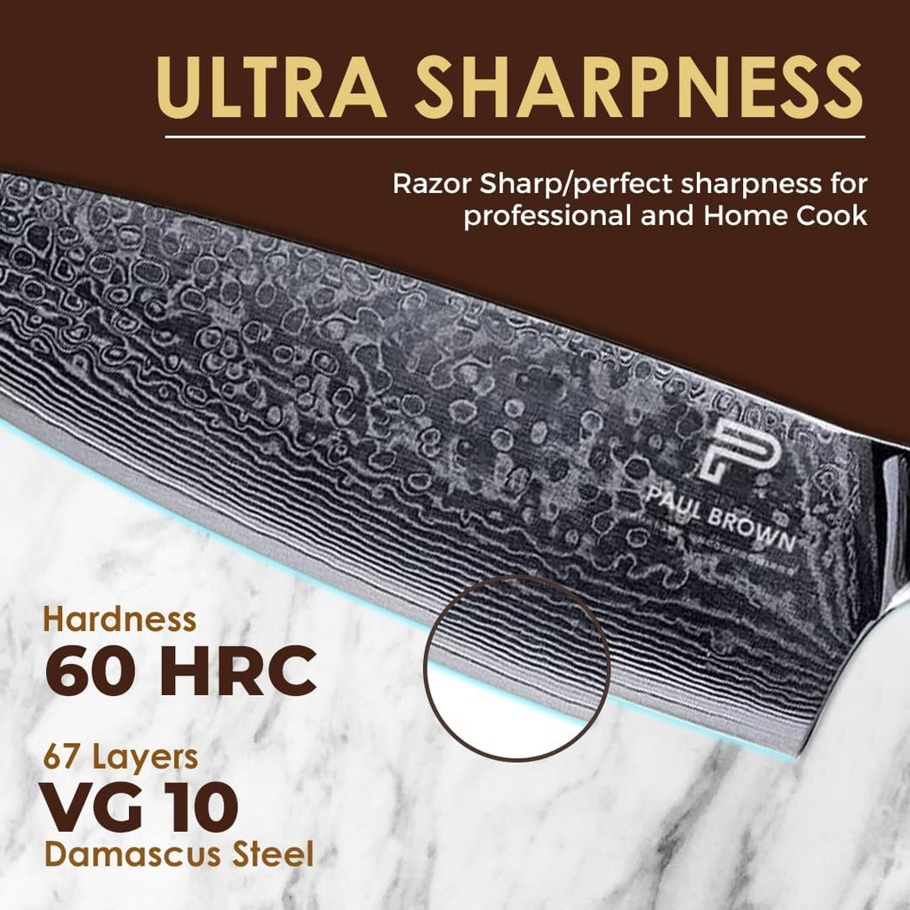 The PAUL BROWN 8-Inch Chef Knife is the ultimate all-purpose kitchen tool, combining precision, durability, and elegance. Expertly crafted with a VG10 Japanese steel core and 67 layers of Damascus steel, this knife offers razor-sharp performance, superior hardness, and long-lasting edge retention. The striking Damascus pattern adds both beauty and reduced friction, ensuring smooth and effortless slicing. Designed with a durable ergonomic G10 handle, it provides a secure, comfortable grip for professional chefs and home cooks alike. Whether chopping vegetables, slicing meat, or dicing herbs, this premium chef’s knife delivers unmatched balance, sharpness, and control.