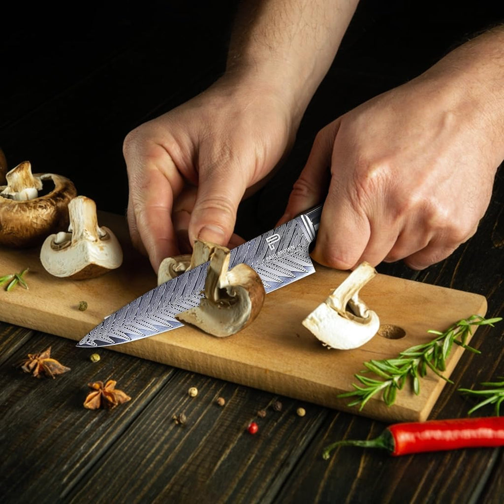 The PAUL BROWN Premium Chef Knife (8") is expertly crafted from high-carbon Japanese steel to deliver superior sharpness, strength, and precision. Its hammered finish not only adds a striking, professional look but also minimizes food sticking, ensuring smooth and effortless slicing. Designed with an ergonomic wooden handle, this knife offers a comfortable and secure grip, making it a reliable companion for both professional chefs and home kitchens. Corrosion-resistant and ultra-durable, it’s perfect for tackling everything from delicate vegetables to tougher cuts of meat. This 8-inch chef knife is a versatile, all-purpose essential that combines elegance with performance.