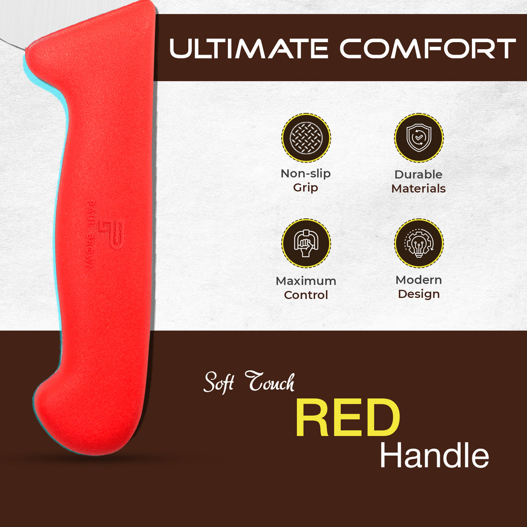 Elevate your cooking experience with the 10-Inch X50CrMov15 Chef Knife, designed for both professional chefs and home culinary enthusiasts. The blade is crafted from high-quality stainless steel for excellent edge retention, sharpness, and durability, making every cut precise and effortless. Its ergonomic soft-touch red handle provides a comfortable grip and adds a vibrant touch to your kitchen tools. Whether you're chopping vegetables, slicing meat, or dicing herbs, this versatile chef’s knife offers exceptional control and performance, ensuring your kitchen tasks are completed efficiently and with ease.