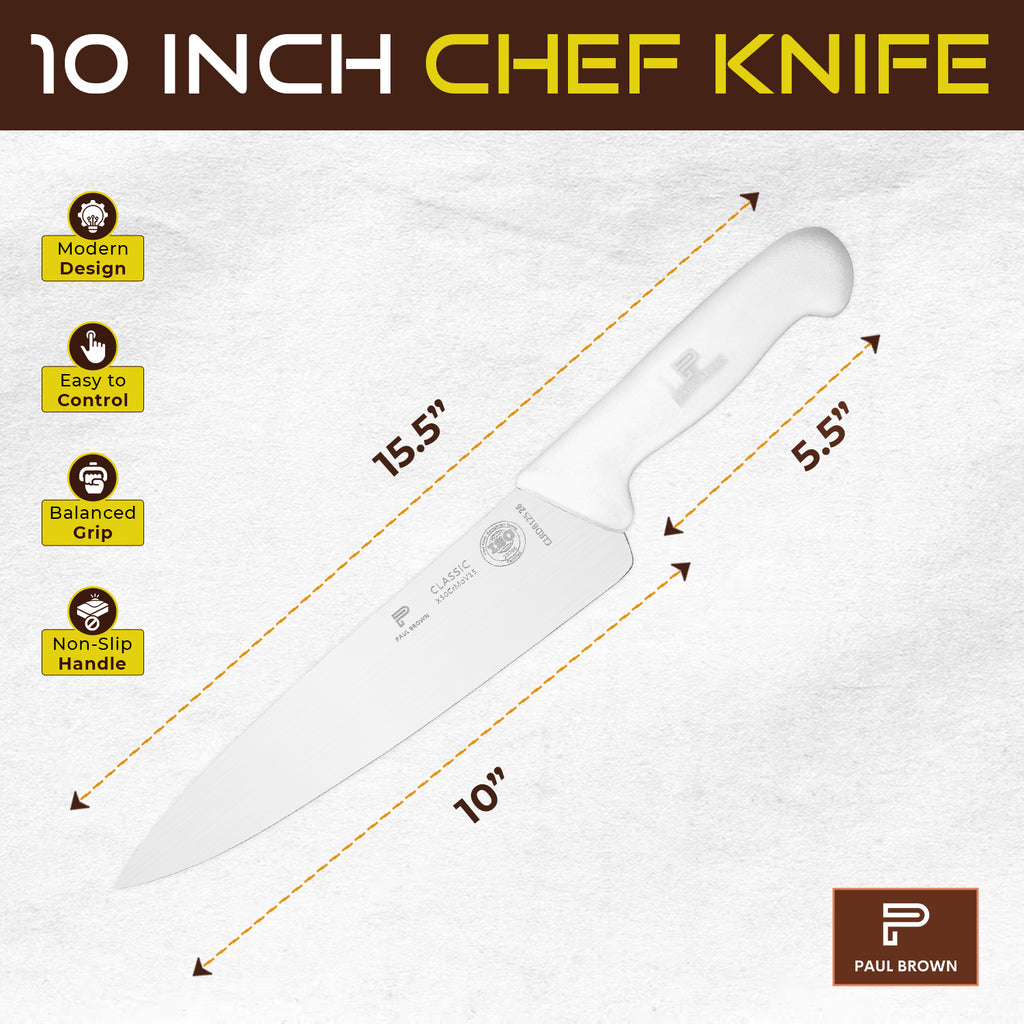 Elevate your cooking experience with the 10-Inch X50CrMov15 Chef Knife, designed for both professional chefs and home culinary enthusiasts. The blade is crafted from high-quality stainless steel for excellent edge retention, sharpness, and durability, making every cut precise and effortless. Its ergonomic soft-touch white handle provides a comfortable grip and adds a vibrant touch to your kitchen tools. Whether you're chopping vegetables, slicing meat, or dicing herbs, this versatile chef’s knife offers exceptional control and performance, ensuring your kitchen tasks are completed efficiently and with ease.