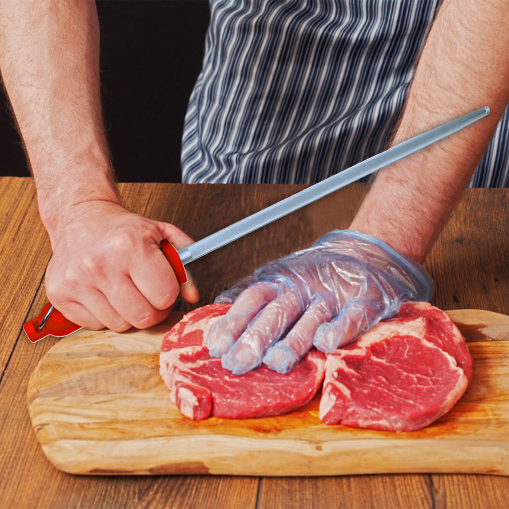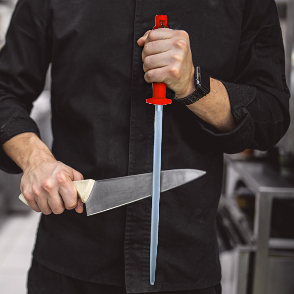 Upgrade your kitchen tools with the reliable PAUL BROWN Classic Honing Steel, designed for precision and durability. Crafted from high-quality German steel, this 12-inch honing rod ensures your knives remain sharp and slicing seamlessly. The soft-touch red handle provides a comfortable grip, making sharpening safe and effortless.