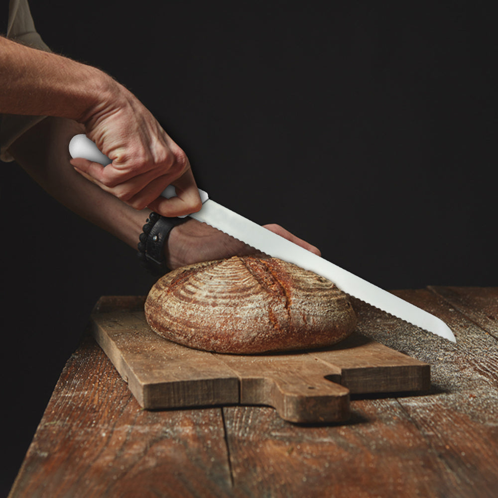 Experience effortless slicing with the PAUL BROWN Classic Bread Knife, designed for professional quality and durability. Crafted with precision from high-quality stainless steel and featuring a comfortable, soft-touch white handle, this knife is perfect for cutting through bread, baguettes, and other baked goods with ease.