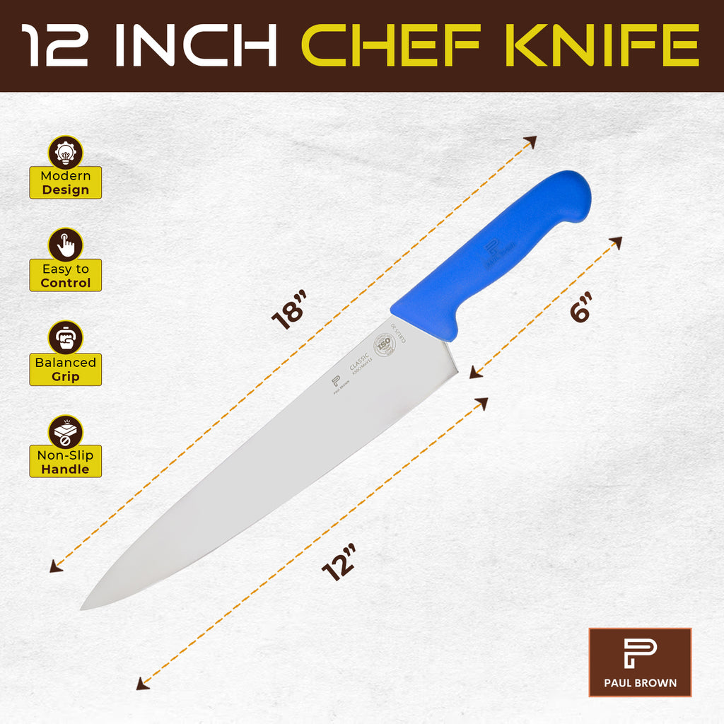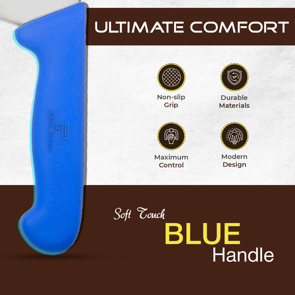 Elevate your culinary experience with our premium 12-inch chef knife, crafted from high-quality X50CrMov15 stainless steel for exceptional durability and edge retention. Designed for both professional chefs and home cooks, this versatile knife delivers precise cuts through meats, vegetables, and more. The ergonomic soft-touch blue handle offers a comfortable grip, reducing fatigue during extended use and adding a vibrant touch to your kitchen tools. Its balanced weight and sharp, durable blade make it essential for efficient and enjoyable cooking.