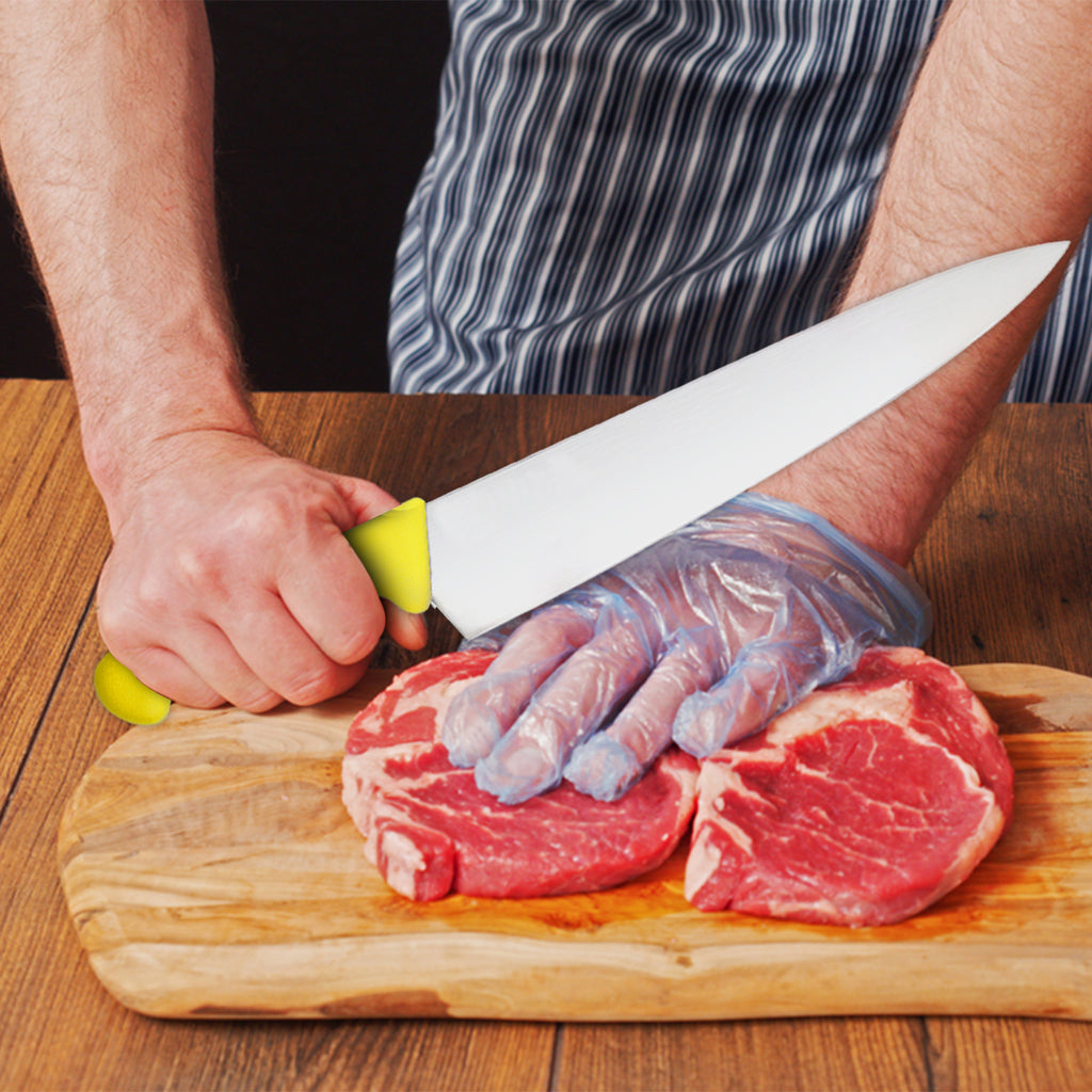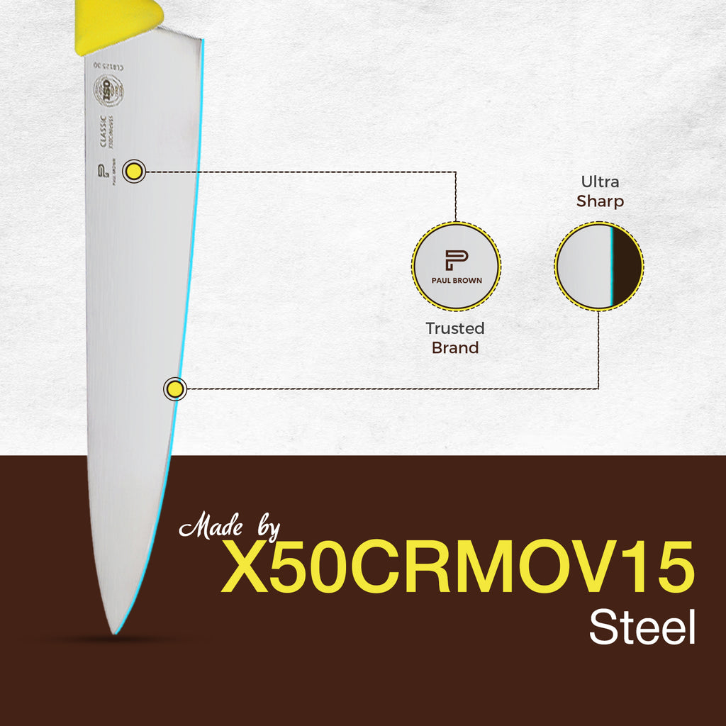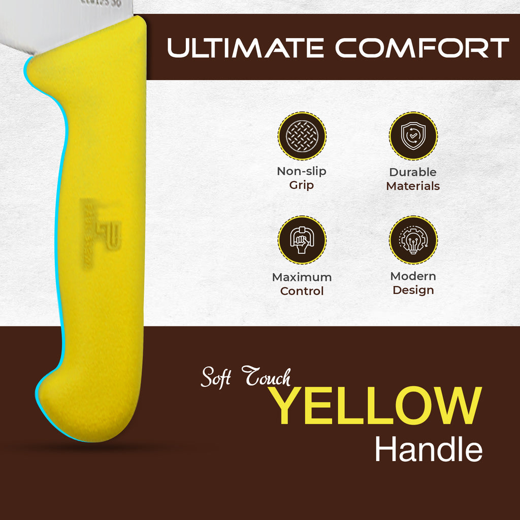 Elevate your culinary experience with our premium 12-inch chef knife, crafted from high-quality X50CrMov15 stainless steel for exceptional durability and edge retention. Designed for both professional chefs and home cooks, this versatile knife delivers precise cuts through meats, vegetables, and more. The ergonomic soft-touch yellow handle offers a comfortable grip, reducing fatigue during extended use and adding a vibrant touch to your kitchen tools. Its balanced weight and sharp, durable blade make it essential for efficient and enjoyable cooking.