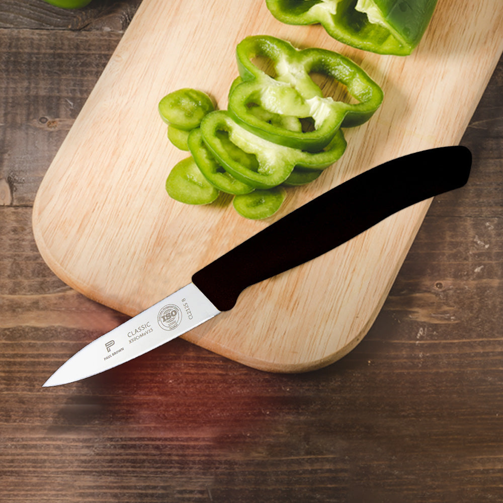 Elevate your kitchen essentials with the PAUL BROWN Classic Paring Knife, crafted for precision and comfort. Its compact 3-inch blade is perfect for peeling, trimming, and detailed tasks, making it an indispensable tool for every home chef. The sleek, soft-touch black handle ensures a secure grip, allowing for safer and more controlled slicing.
