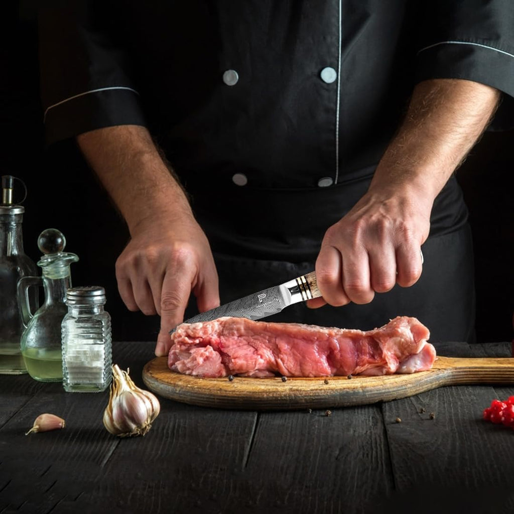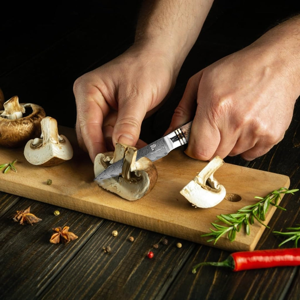 The PAUL BROWN Premium Paring Knife (3.5") is a compact yet powerful tool, designed for precision tasks in the kitchen. Crafted from high-carbon Japanese steel, it delivers razor-sharp performance, exceptional durability, and long-lasting edge retention. The hammered blade finish not only adds a sophisticated look but also minimizes friction and prevents food from sticking. Its ergonomic wooden handle ensures comfort, balance, and control, even during extended use. With a corrosion-resistant ultra-sharp edge, this 3.5-inch knife is perfect for peeling, trimming, and intricate cutting tasks, making it an essential for both professionals and home cooks.