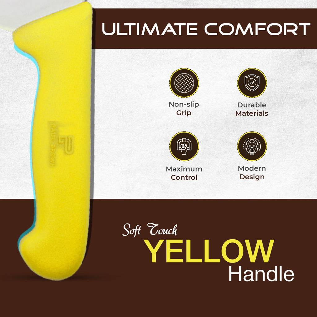 Elevate your cooking experience with the 10-Inch X50CrMov15 Chef Knife, designed for both professional chefs and home culinary enthusiasts. The blade is crafted from high-quality stainless steel for excellent edge retention, sharpness, and durability, making every cut precise and effortless. Its ergonomic soft-touch yellow handle provides a comfortable grip and adds a vibrant touch to your kitchen tools. Whether you're chopping vegetables, slicing meat, or dicing herbs, this versatile chef’s knife offers exceptional control and performance, ensuring your kitchen tasks are completed efficiently and with ease.